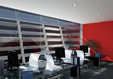 continue su due lati contigui, e l'oscuramento con frangisole in alluminio posti su tubolari in acciaio.