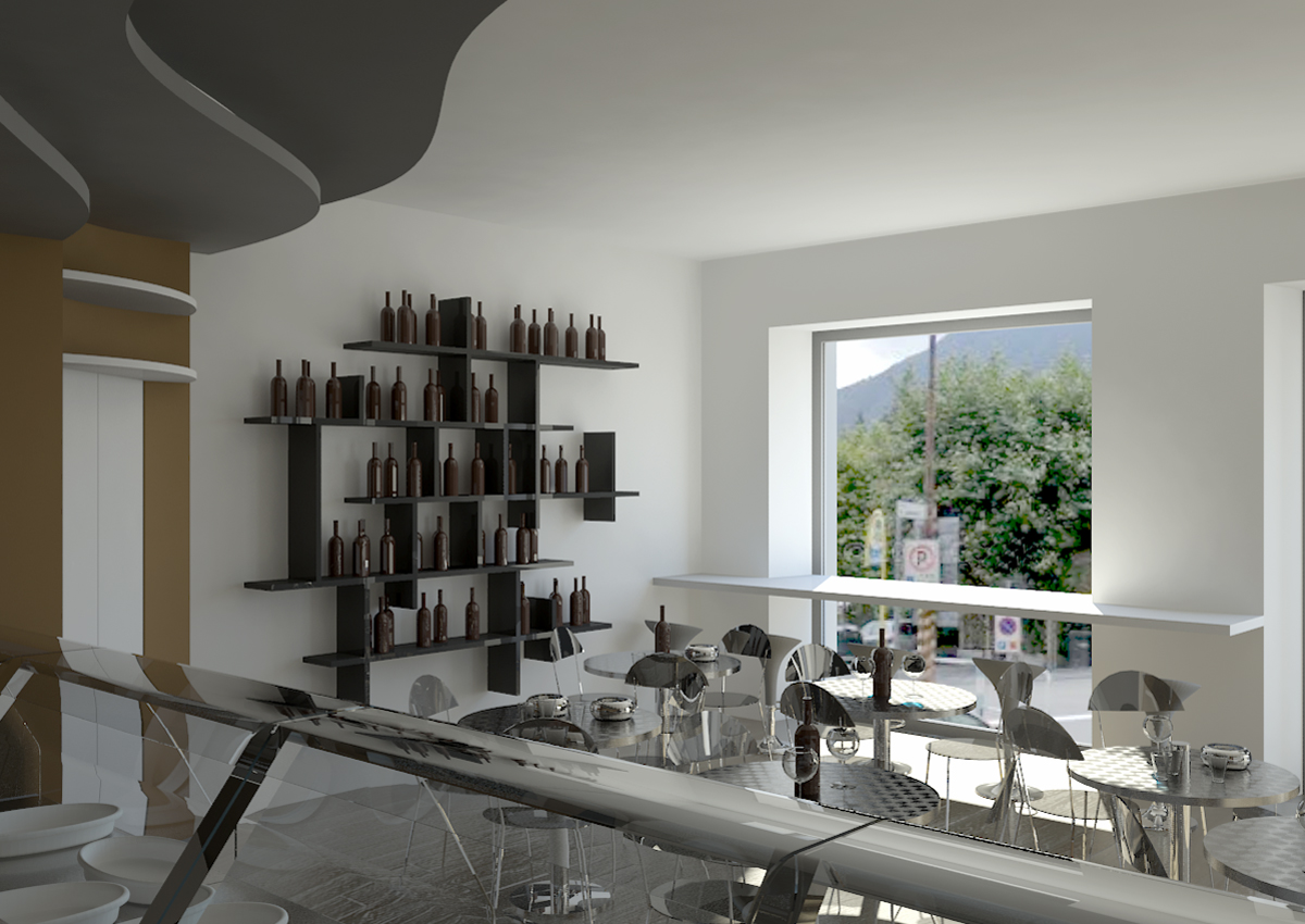 Il progetto prevede la realizzazione di pareti attrezzate ai lati del bancone per l'esposizione di prodotti e per l'ingresso al retro del bancone.