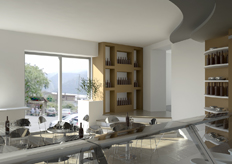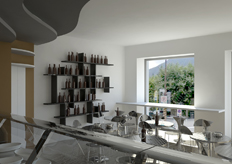 La parete attrezzata alle spalle del bancone costruita in cartongesso presenta una forma irregolare per accentuare la modernità del'intervento, e allo stesso tempo funge da espositore.