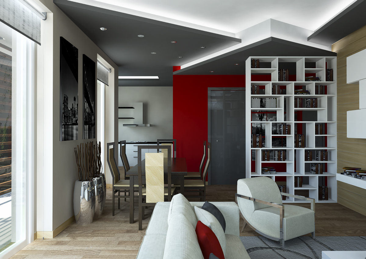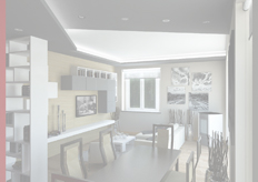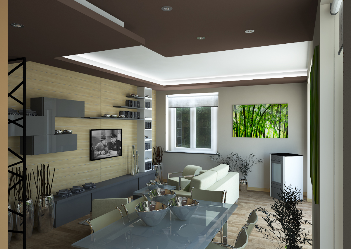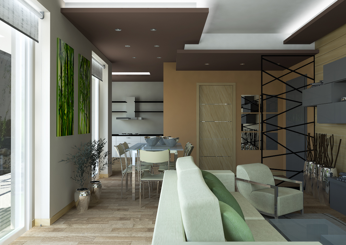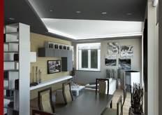 previsti controssoffiti per 'movimentare' il soffitto e il rivestimento della parete attrezzata della zona giorno con pannelli di legno.