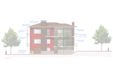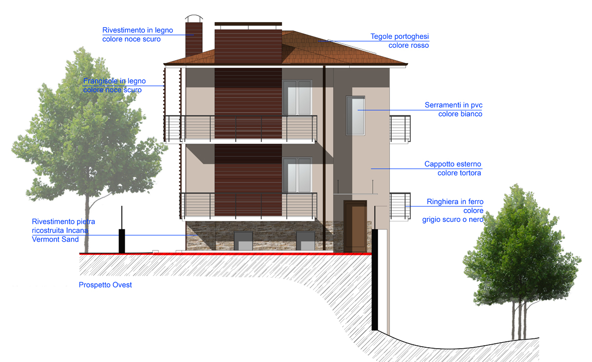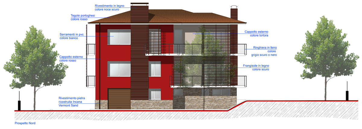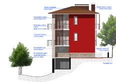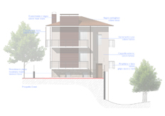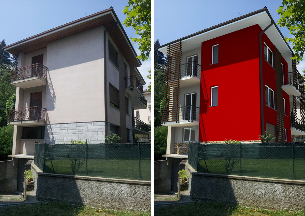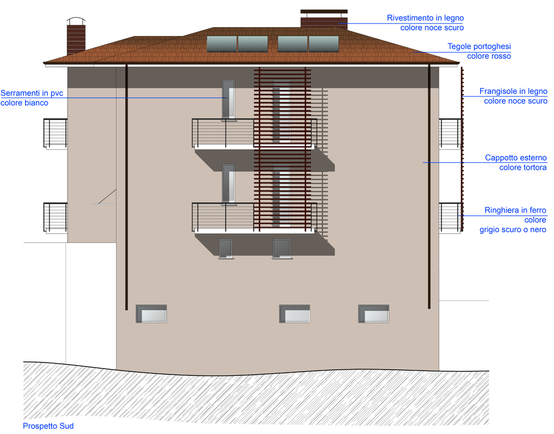 - Esternamente verranno realizzati frangisole in doghe di legno per schermare le finestre della zona giorno; un nuovo colore per rendere pił moderno l'edificio e la sostituzione del